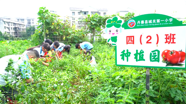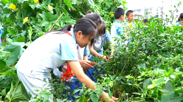 在縣城關第一小學的勞動基地裏,學生們三兩合作,小心翼翼地拔起成熟的辣椒、絲瓜、花生等,大家齊心協力,幹勁十足,不一會兒便收穫頗豐。