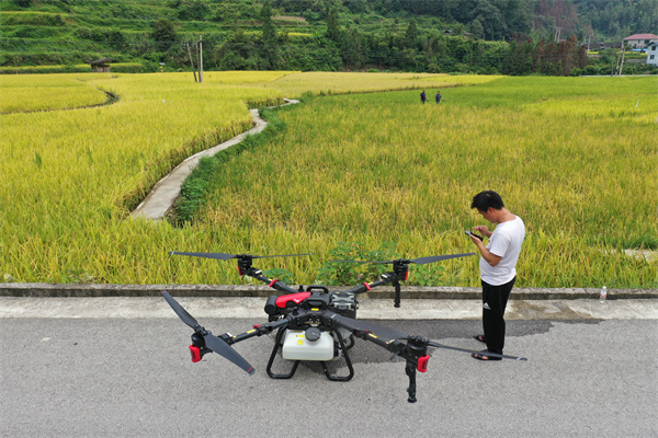 四片螺旋槳、結實的機臂、墨紅相間的機身下方挂着水箱,青黃色的稻田邊,一台“炫酷”的“極飛無人機”格外顯眼。