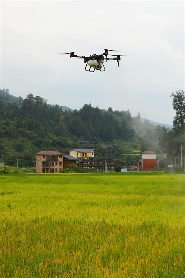 “極飛無人機”最大負載量可達50升,相比於傳統人工作業方式,無人機噴灑均勻、霧化效果好、不受作物長勢和地形限制。今年,太擁鎮共種植山地生態水稻600畝,主要集中在寨甩村和昂英村,原先打藥或者施肥需要40個人輪流作業。採用無人機作業後,預計1-2天就可以完成600畝地的施肥作業。