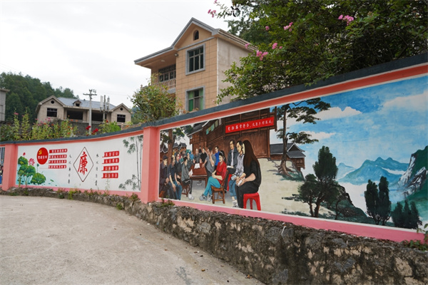岑鞏縣龍田鎮代店村水井溝組,五彩墻繪與農家院落繁花自成一景。(吳念 攝)
