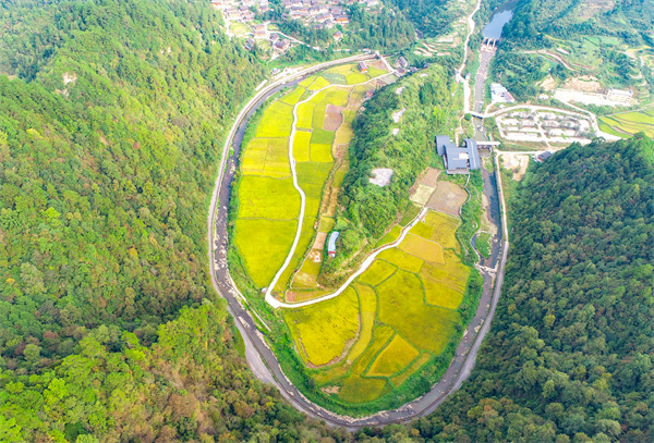 排羊鄉排扎村水稻成熟(無人機照片)。(張奎 攝)