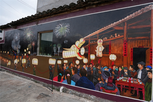 來到楊柳村,一幅描繪土家族人民樂新婚場面的彩繪躍然“墻”上。“這些畫看起來很漂亮,給人感覺非常舒適,也讓大家都感受到我們土家族人民的文化生活。”該鄉楊柳村村民王香花對這裡的墻畫讚嘆不已。