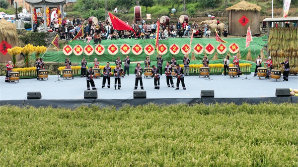 田地裏,岑鞏縣各族群眾歡聚一堂,圍繞豐收主題,或載歌載舞,或鑼镲齊鳴,或野趣十足。舞蹈《豐收鼓舞》熱鬧歡樂,讓人心情愉悅;華陰老腔表演《將令一聲震山河》鏗鏘有力,讓人熱血沸騰;打擊樂《思州戰鼓》氣勢恢宏,催人奮進;情景表演《開鐮收割》,盡顯豐收喜悅。
