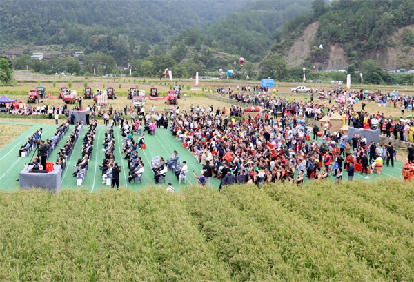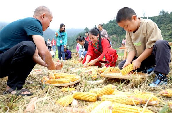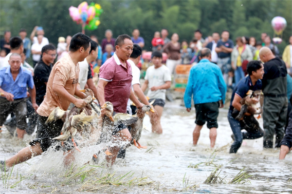 在精彩的歌舞表演後,剝玉米、挑稻穀、搶鴨子、稻田摸魚、拔河等一項項富有鄉土氣息、貼近生産生活的鄉村趣味賽輪番上演,來自各地的游客和當地群眾積極參賽,大家鉚足幹勁、奮勇爭先,共同體驗着農事活動帶來的無窮樂趣和獲得感。