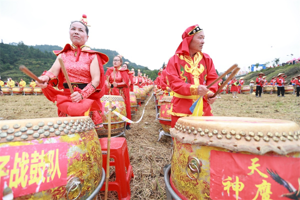 2023年中國農民豐收節·岑鞏豐收大典活動現場,岑鞏戰鼓隊在表演。(李昌焯 攝)