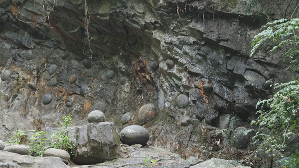 據了解,産蛋崖是三都特有的中國地質奇觀,崖壁上天然鑲嵌着上百顆堅硬無比的卵形石蛋,都生長在看上去毫不相干的灰岩石層中,而且平均三十年裏,石崖便會自動生産排放一次石蛋。面對這一種神秘現象,中外學者皆稱為 “世界之謎”,至今仍無人能解釋其中原因。(李榮發)