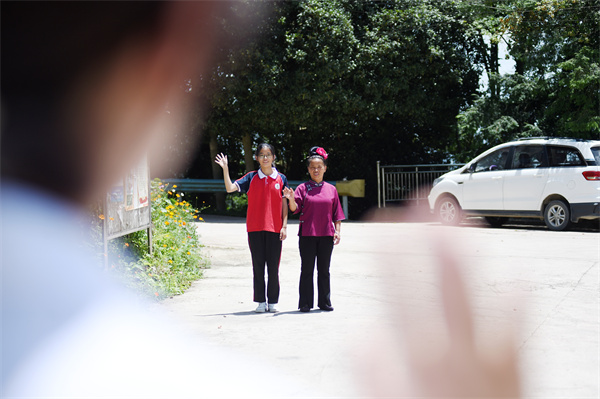 在貴州省&江縣南宮鎮東依村,學生楊秀雲同母親給臨行前的曾武舞揮手告別。(邰驍 攝)