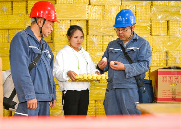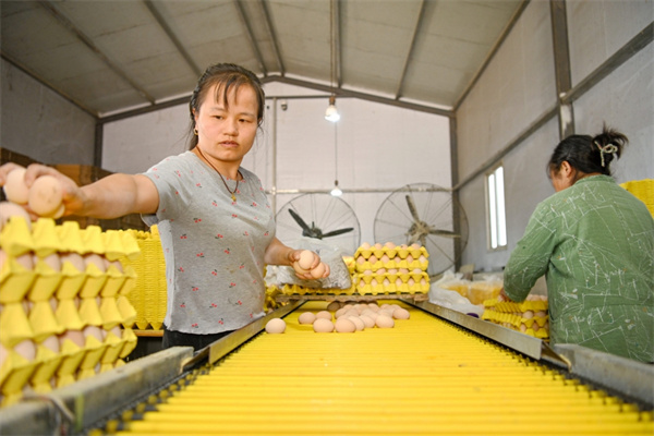 岑鞏縣龍田鎮都素村蛋雞養殖基地,工人在流水線上進行檢蛋、裝箱、打包。(楊啟志 攝)