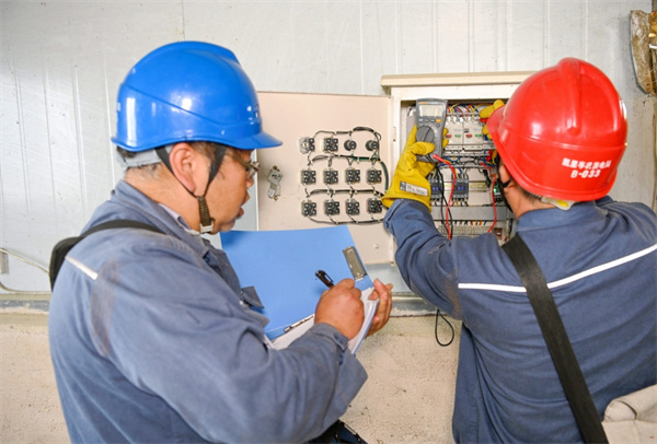 岑鞏縣龍田鎮都素村蛋雞養殖基地,南方電網岑鞏供電局工作人員在排查用電隱患。(楊啟志 攝)