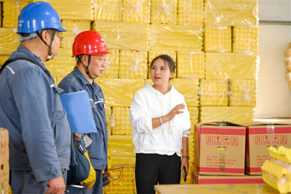 岑鞏縣龍田鎮都素村,南方電網岑鞏供電局工作人員向蛋雞養殖基地負責人了解用電需求。(楊啟志 攝)