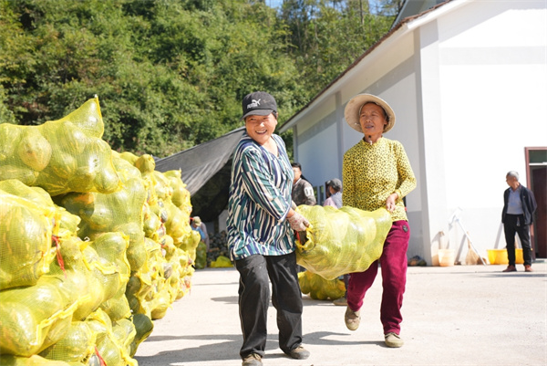 貴州省岑鞏縣客樓鎮上石坎村,村民將裝袋好的南瓜碼放整齊。(吳祥華 攝)