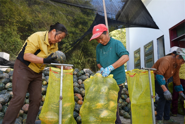 貴州省岑鞏縣客樓鎮上石坎村,村民將采收好的南瓜裝袋。(吳祥華 攝)