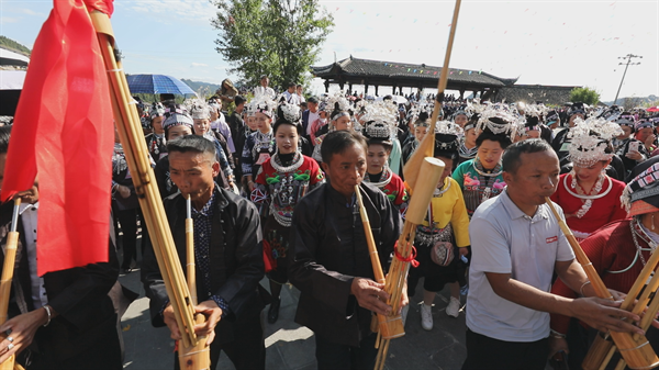 “‘吃新節’是我們苗族的傳統節日,是一個慶祝豐收的節日,這天相當於漢族的過年一樣熱鬧。今天姐妹們都穿上最漂亮的服裝,戴上最好看的頭飾,來到這裡舞蹈、跳月,表達了我們對豐收的喜悅之情。”苗族群眾李羽蝶説。