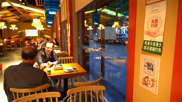 除了學校,全縣的餐飲企業也用實際行動,杜絕舌尖上的浪費。在一家飯店,店內醒目位置張貼文明用餐、‘光盤行動’等相關宣傳標語,時刻提醒顧客要珍惜糧食,適量點餐。店員正向消費者詳細介紹菜品份量,引導顧客適度點餐,就餐結束後,主動向顧客提供免費打包盒和打包袋,服務引導顧客將剩餘餐品打包帶走,達到“光盤”要求。