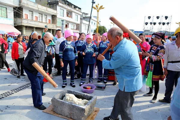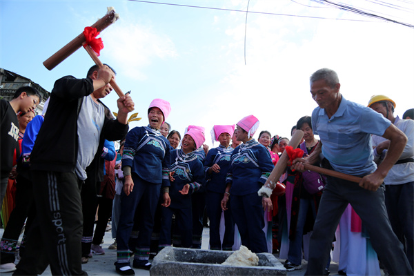 平塘縣通州鎮群眾王英高興地説:“我們過重陽節,我們就要打重陽粑,分發下去給老老幼幼、朋朋友友、弟弟兄兄都得重陽粑吃,得了這些都很高興的,我打粑粑、抬粑粑我都高興的”