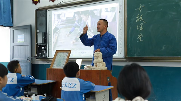 除了聚焦“創新”,潘玉華也不忘傳承人肩負的重任,長期以來,他以學校為載體,搭建起了文化傳承的橋梁,通過每學期制定皮紙製作技藝相關課程進校園的形式,為學生普及本土優秀傳統文化,為傳統手藝的傳承和發展奠定基礎。丹寨縣南皋小學學生龍韻方説:“老師説的內容非常有趣和具體,讓我對古法造紙術有了巨大的了解。同時我覺得生在“造紙之鄉”非常的自豪,我也想把這門技術學好,傳承下去,不能讓它流失掉。”