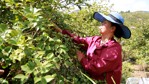 基地工人陳國松説:“我們每天七點多左右過來摘茶果,工資大概一天一百多左右,採摘朝着大顆的、紅的要在它裂開之前把它採摘到茶果廠去加工這樣的出油率才高。”