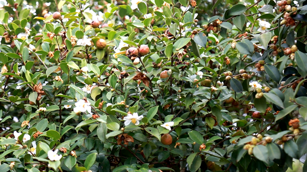走進龍興村,一樹樹油茶花競相綻放,清香四溢,潔白的花瓣、金色的花蕊,與綠葉相間相映,美不勝收。一顆顆圓潤的油茶果挂在樹梢,與燦爛的油茶花共生共榮,100多名群眾穿梭在茶林中,忙着採摘油茶果,享受一年豐收的喜悅。