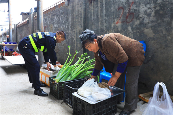 “謝謝你們,幫我搬了一趟又一趟,辛苦了。”攤販王大姐接過執法人員手中的菜籃子,連連道謝。