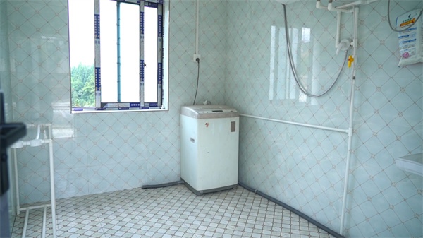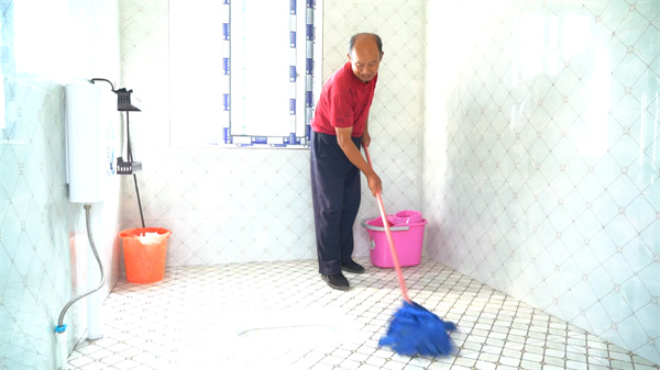 來到位於丹寨縣揚武鎮幹改村的老人龍勝江家裏,房前屋後乾淨整潔,廁所地面鋪上了精美瓷磚,抽水蹲便器、洗手池、淋浴設備、洗衣機一應俱全。龍大爺告訴筆者,自從2021年村子進行了旱廁改造後,家家逐漸用上了室內衞生間、水衝廁所,如廁徹底告別了“夏天臭烘烘 冬天沒法用”的情況。
