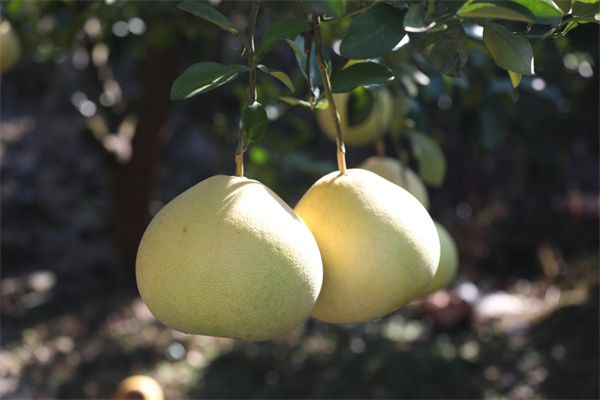 碩大飽滿、黃澄澄的柚子懸挂枝頭。(李昌焯 攝)