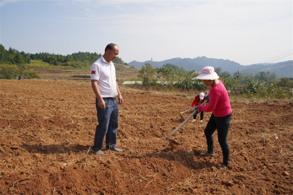 岑鞏縣平莊鎮後坪村走馬坪中藥材基地,技術員在指導村民整理土地。(陳昆 攝)