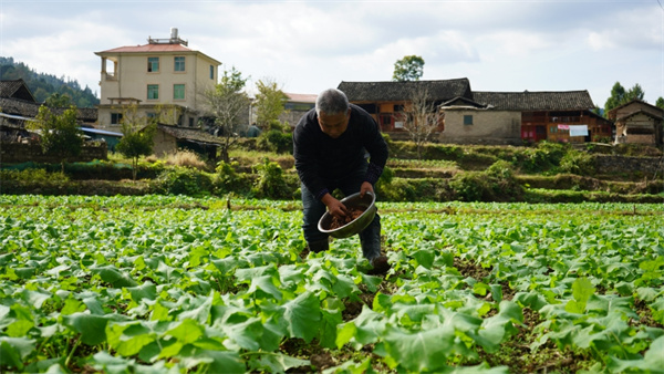種植戶朱明志正在給油菜施肥。(吳念 攝)