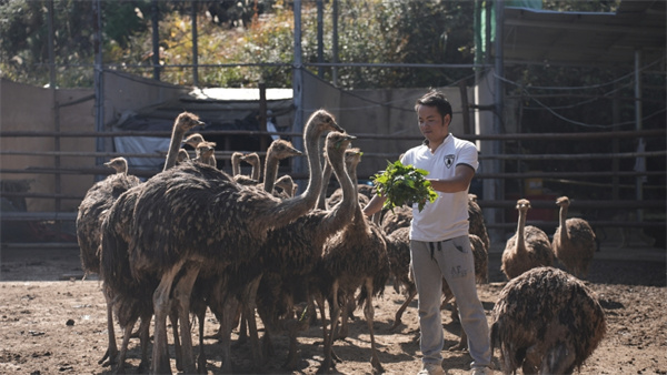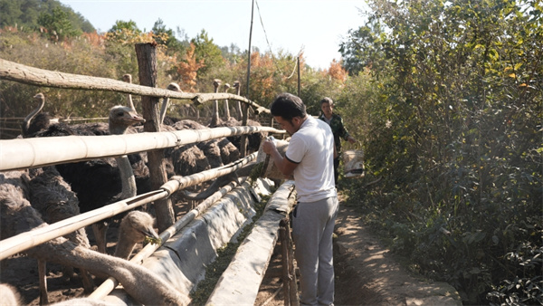 圍欄裏,黑灰兩色相間的鴕鳥在場地內玩耍追逐,鴕鳥養殖戶向朝武正提着飼料桶向鴕鳥們走去,它們瞬間激動起來,紛紛聚攏。