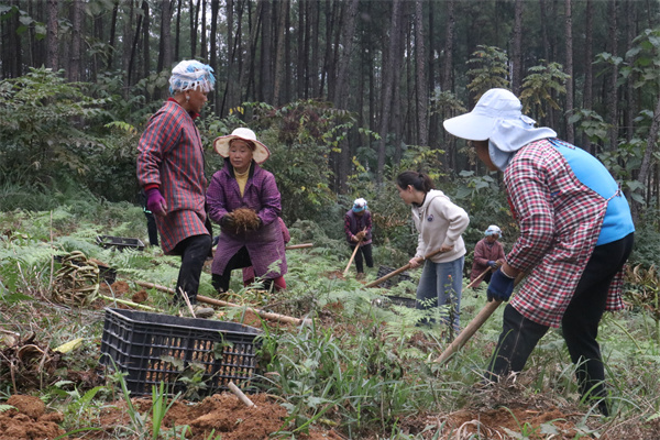 時下,正值魔芋豐收季,走進貴州省施秉縣雙井鎮林下魔芋種植基地,映入眼簾的是一片忙碌的景象。農戶們有組織有序列地分散在基地各處,熟練地揮動着手中的鋤頭,將魔芋從泥土中翻起、分揀整理、裝箱,一片熱火朝天的豐收景象。