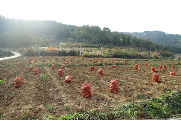 圖為採挖好的魔芋和着正在移栽油菜的群眾