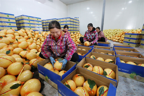 在岑鞏縣民豐果樹種植專業合作社包裝車間,村民們將換上新“裝”的思州柚裝箱。(李昌焯 攝)
