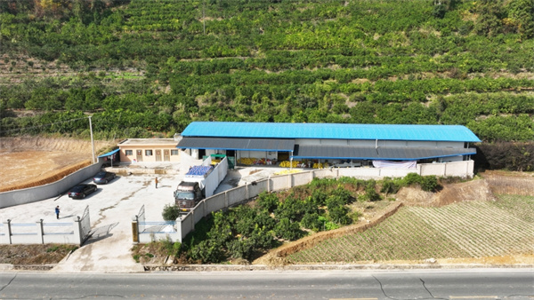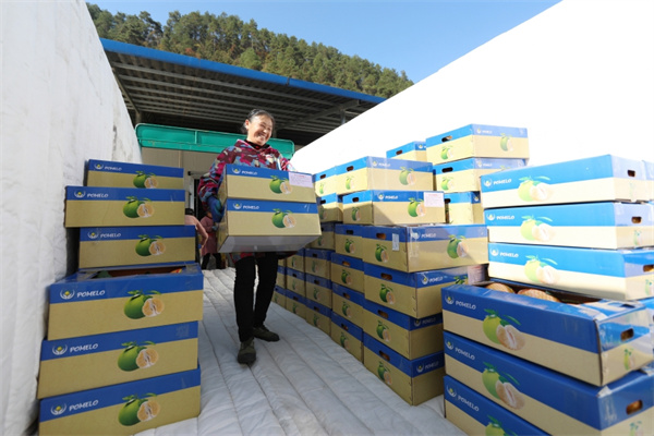 在岑鞏縣民豐果樹種植專業合作社,村民們將打包好的思州柚裝車。(李昌焯 攝)