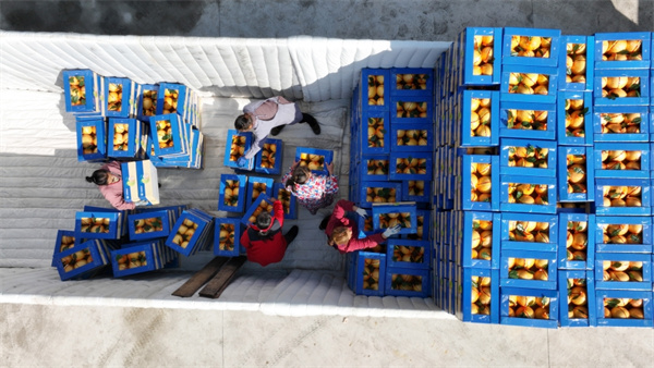 在岑鞏縣民豐果樹種植專業合作社,負責人劉壽軍(左一)與村民一起裝車。(李昌焯 攝)