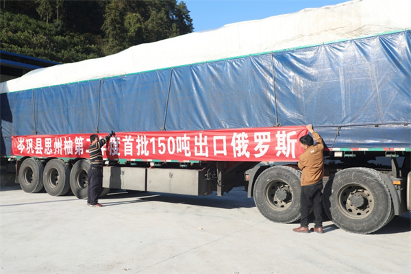 初冬時節,走進貴州省岑鞏縣注溪鎮周坪村,岑鞏縣民豐果樹種植專業合作社的冷庫裏舖滿了剛從基地採摘來的思州柚,瀰漫着濃濃柚子果香的加工生産線上,20余名村民正加緊準備出口俄羅斯的訂單,經過清洗、覆膜、打包、搬運等工序,一個個肥碩飽滿的思州柚換上新裝、裝滿貨車,即刻啟程去往俄羅斯。