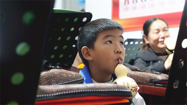 11月27日,趙胡睿陽在培訓班練習葫蘆絲吹奏。(李靈 攝)