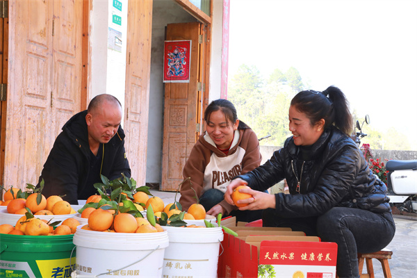 “我弟的臍橙熟了,今天我們一家人來幫他採摘,然後拉出去賣。今年的果果很好,又大又紅又好看。”群眾莫建平喜笑顏開地説。
