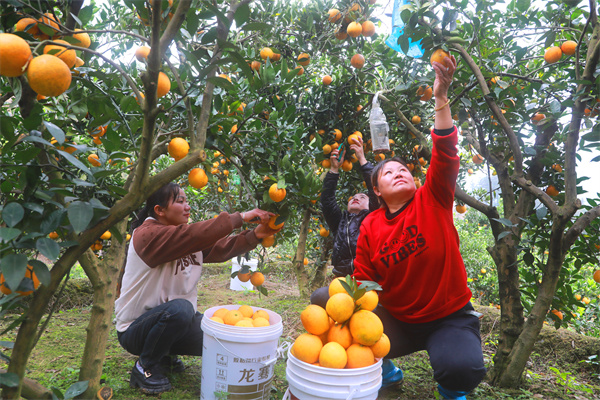 “冬來臍橙黃泱泱,歡迎姊妹來品嘗。我家臍橙圓又大,口感甜得像蜜糖。”一曲即興編唱的民間山歌,將農民豐收的喜悅傳遍整個果園。記者循聲走進三都縣大河鎮臍橙種植果林裏,十幾名群眾正忙着採摘黃澄澄的臍橙,大家有説有笑,滿臉幸福。