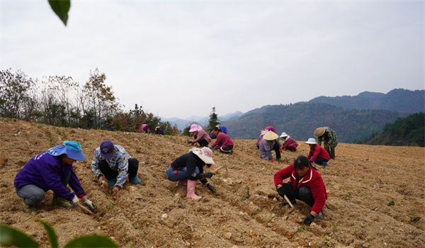 岑鞏縣天馬鎮苗落村吳家庵的新建茶園裏,村民在栽種茶苗。(楊博 攝)