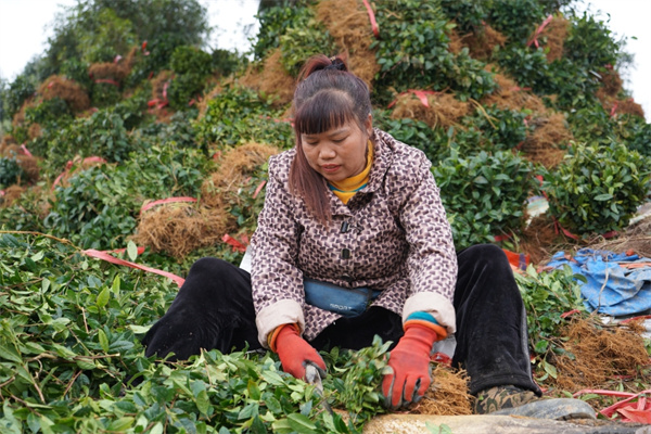 岑鞏縣天馬鎮苗落村村民向香蘭在修剪茶苗。(吳念 攝)