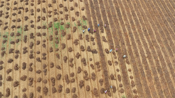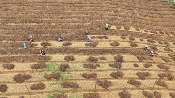 村民在為黃精苗“蓋被子”。(吳國明 攝)