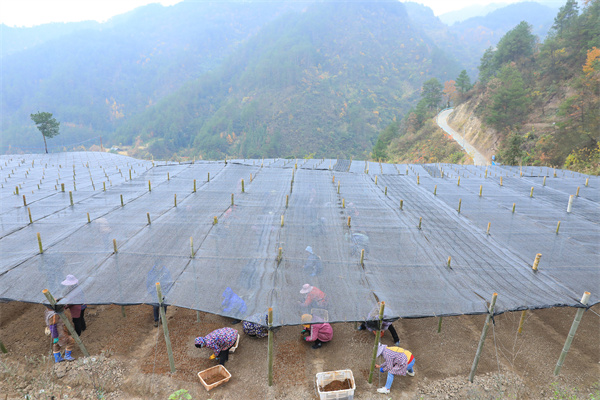冬日清晨,風中透着陣陣寒意。在劍河縣岑松鎮巫門村黃精育苗基地,近百名工人正在分工協作,翻地、打窩、種苗、覆土、蓋松葉……黃精育苗各道工序有條不紊。