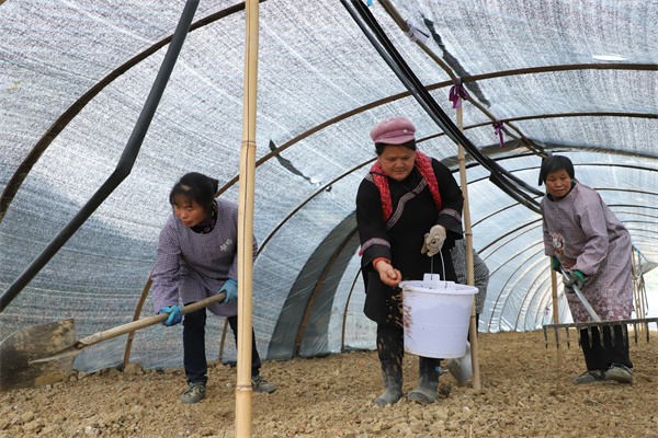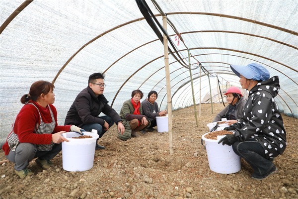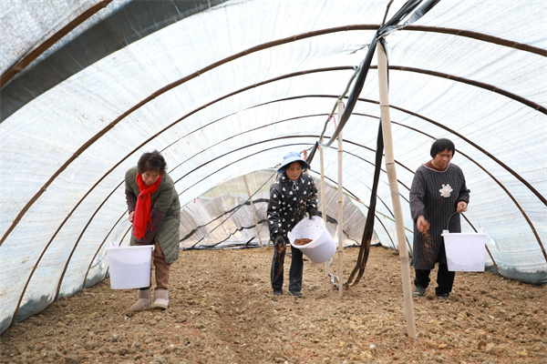 “像我們一個標準棚,菌種基本上撒五桶左右,我們就直接這樣拋高一點,把它撒均勻……”現場進行簡單的種植培訓後,幾十個村民便分散到各個大棚內,翻土地、播菌種、培土。