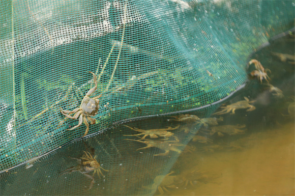 上海海洋大學研究生團隊正在監測稻蟹生長情況。劉夢攝