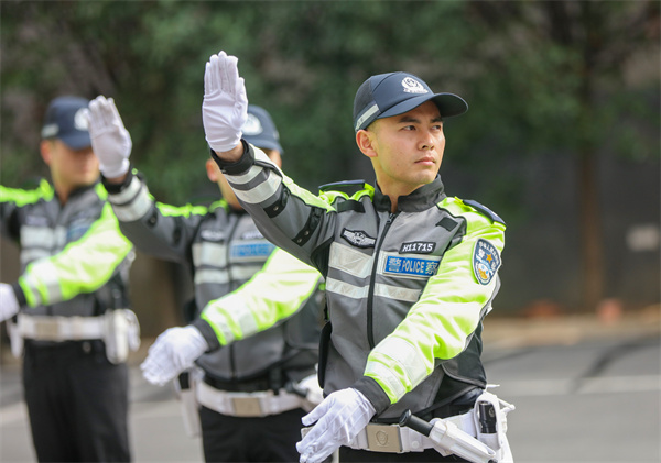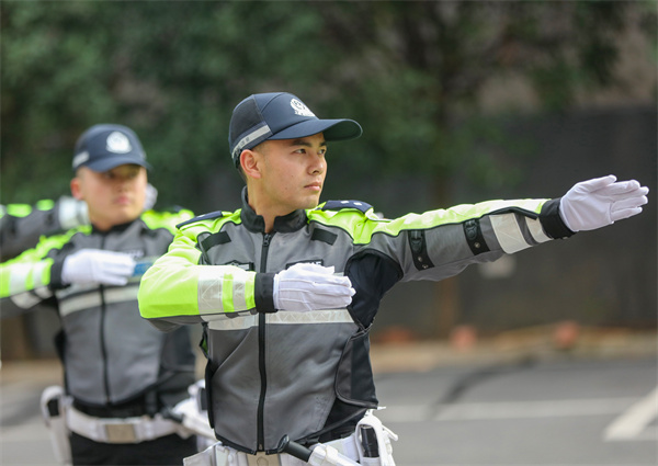 1月10日,貴州省黔東南苗族侗族自治州施秉縣交警進行交警手勢操匯演。(磨桂賓 攝)