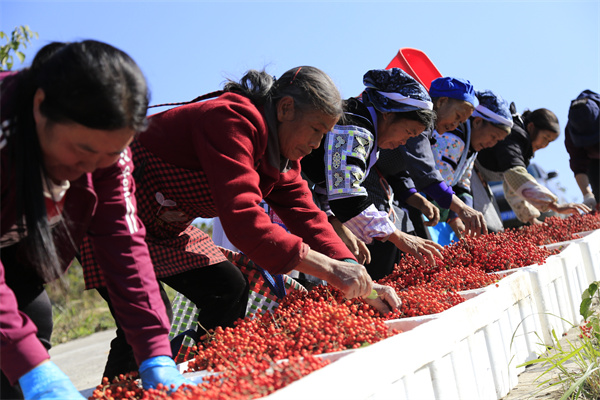 2023年秋冬始交,貴定縣白岩腳山桐子種植基地一片火紅,2552畝山桐子果實綴滿枝頭,飽滿的果粒實現了山桐子産業落地貴定的初期成果。