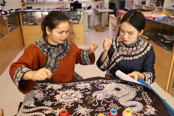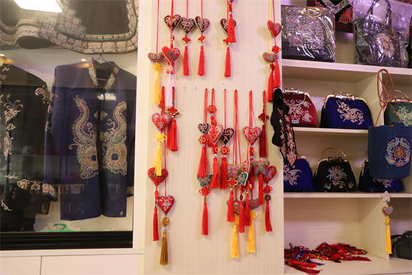 工作室的展櫃裏,擺放着各種含有“龍元素”的擺件、首飾、服飾等,繡品上繡制的“龍”或盤臥雲端,或與鳳凰齊飛,或雙龍戲珠,馬尾繡獨特的繡制方法,讓“龍”更加立體,活靈活現。