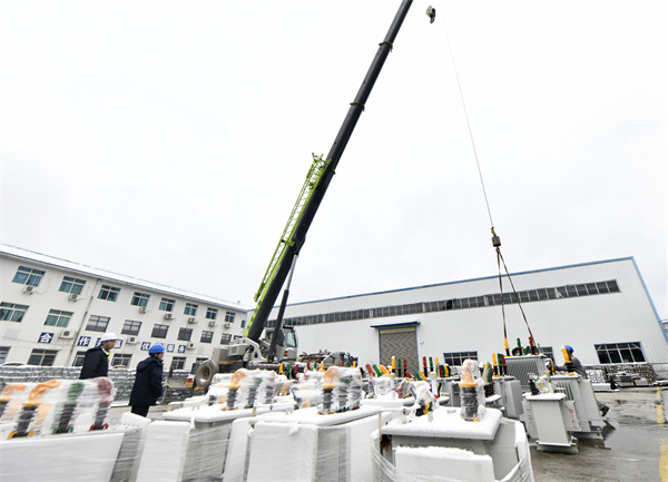 1月22日,在黎平縣德鳳街道,貴州電網凱里黎平供電局物流服務中心在吊裝變壓器。積極做好低溫凝雪天氣下的電力應急物資儲備供應保障。(林世禎攝)