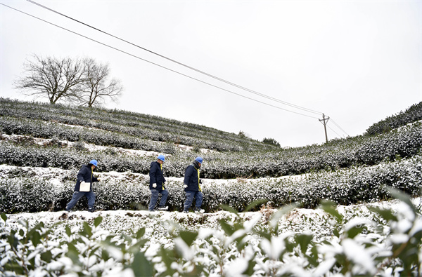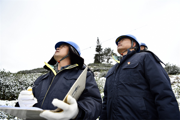 1月22日,在貴州省黔東南苗族侗族自治州黎平縣德鳳街道,南方電網黎平供電局員工對處於地勢較高的10千伏線路進行觀冰巡線。林世禎攝