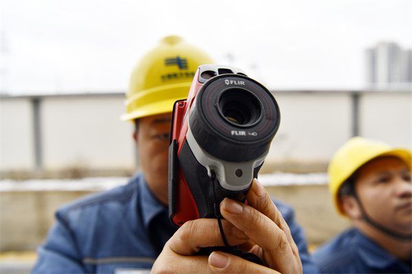 1月22日,在貴州省黔東南苗族侗族自治州黎平縣德鳳街道,南方電網黎平供電局員工用紅外線測溫儀對110千伏矮枧變電站主變進行運行測溫。