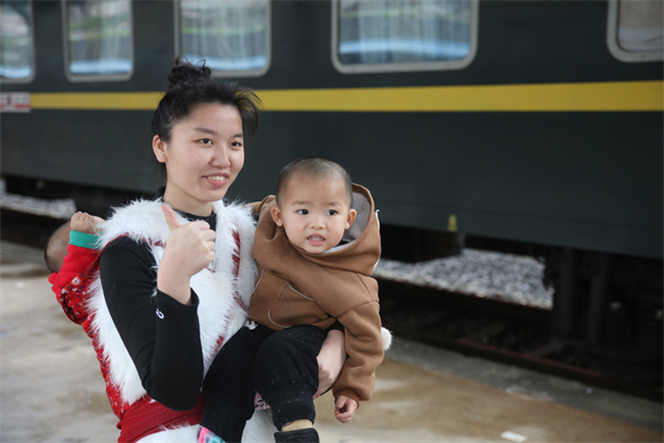 1月31日,在貴州省黔東南苗族侗族自治州施秉火車站,剛進站準備乘車的乘客。(磨桂賓 攝)